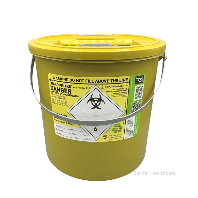SHARPSGUARD® yellow is a comprehensive range of container for the disposal of sharps, including those contaminated with medicinal products and their residues. The container labels indicate that disposal should be by incineration or other authorised processes.