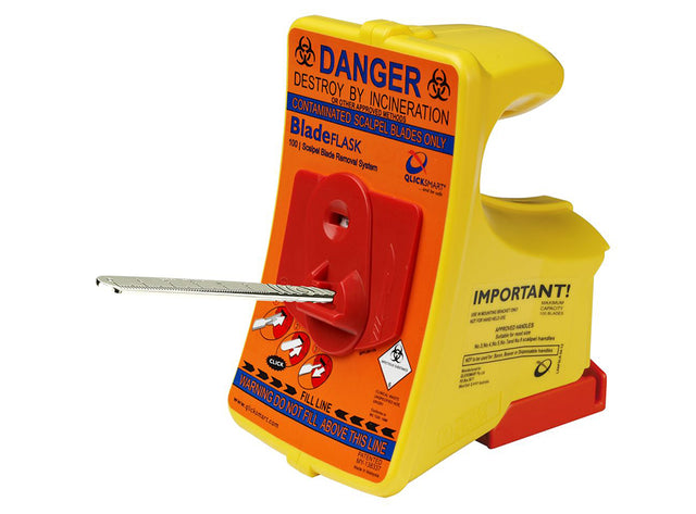 Qlicksmart BladeFLASK provides a simply safer way to remove and contain used scalpel blades. This world-first single-handed scalpel blade remover prevents the dangerous injuries commonly caused by removing blades with fingers, forceps or re-sheathing. BladeFLASK ensures optimal safety based on speed and convenience for the end-user, ergonomic simplicity and passive, automatic and single-handed safety principles. By enabling practitioners to continue to use their preferred metal scalpel handles, the wall mounted or bench-mounted BladeFLASK improves both patient care and staff safety. BladeFLASK meets these essential safety standards. BladeFLASK is a puncture proof sharps container which when it is full, can be disposed of safely without any further exposure to sharps contact. BladeFLASK has auto shut-off to prevent over-filling. It has a built-in counter with a shut-off mechanism that activates automatically after 100 blades have been removed. There is therefore no danger of overfilling. Improves patient safety, by enabling surgeons to use ergonomic precision steel scalpels. Improves staff safety, by ensuring the used scalpel blade is removed with a safe single-handed technique and then safely contained until final disposal.