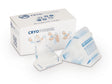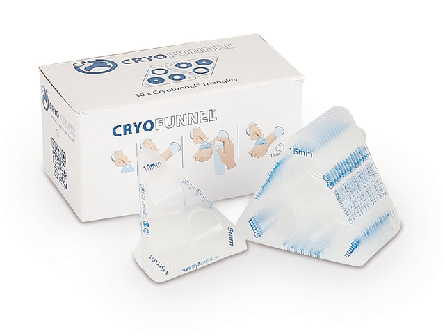 Cryofunnels are used to apply liquid cryogen (from an aerosol) to the treatment area. The funnels have three apertures depending on the size of the area to be treated. Applying pressure ensures a seal over the treatment area and the cryogen then evaporates and freezes the area in the process.