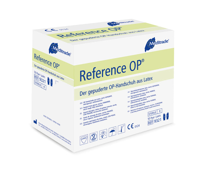 Features Reference™ OP is a powdered surgical glove made from an exceptionally soft, smooth and very stretchable latex structure with optimum grip and microroughening, which makes this glove very comfortable to wear and provides a high level of touch sensitivity, especially on the fingertips. The optimum fit ensures that long-term users can work for several hours in the operating theater without fatigue. The light powdering guarantees that the gloves can be put on and taken off with ease. Sterile, powdered, microroughened, anatomically formed, with rolled edge, and disposable.