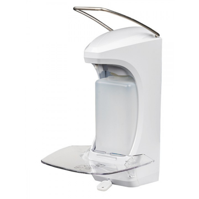 RX 5 M dispenser for disinfectant, alcogel, soaps and flowable lotions, for 500 ml standard Euro bottles, white plastic housing, exchangeable plastic pump, dosage 1.5 ml/stroke, incl. empty HDPE bottle.