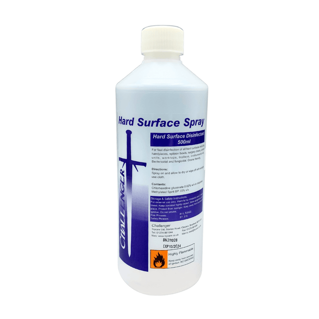 For rapid disinfection of hard surfaces. Challenger Hard Surface Spray is a 70% IMS surface disinfectant designed to kills a broad spectrum of bacteria, viruses and fungi within two minutes, including HIV and HBV.