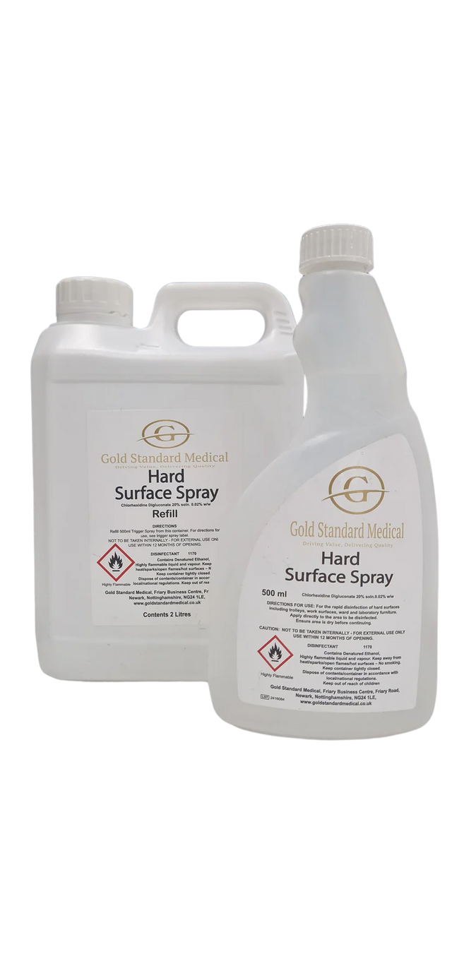 Chlorhexidine Hard Surface Spray is to be used for the rapid disinfection of hard surfaces including trolleys, work surfaces, clinical furniture and footwear.
