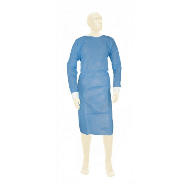 The Maximum protection gown is made of 3 ply, soft SMS composite material. The combined layers guarantee a high barrier against liquid germs and light chemical splashes.