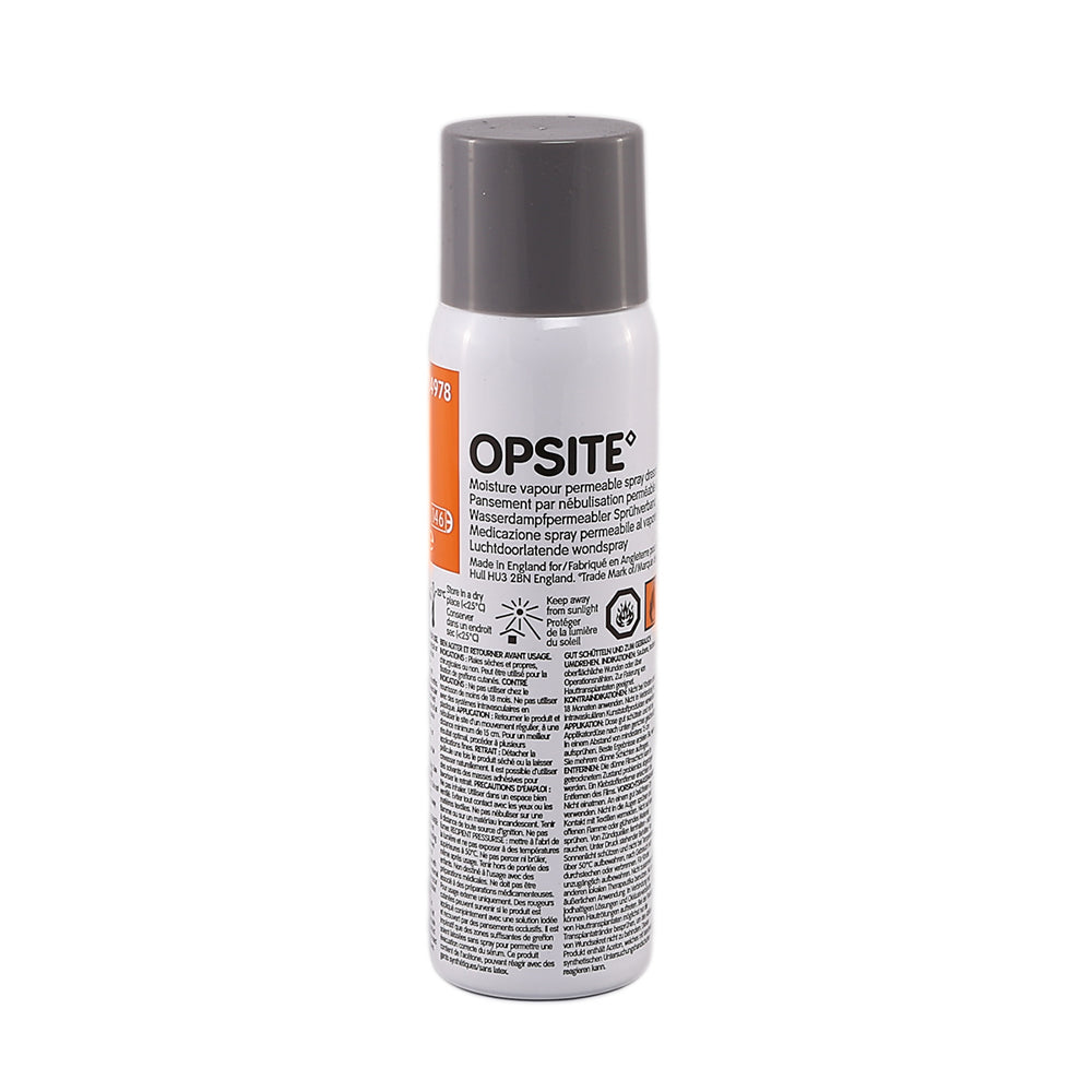 The OPSITE spray is a moisture vapour permeable spray dressing. It is a transparent and quick-drying film which is easy and convenient to apply. The film helps to provide protection for dry minor surgical and surface wounds. It is water resistant and conformable and elastic. This product contains no chlorofluorocarbon (CFC) propellants.