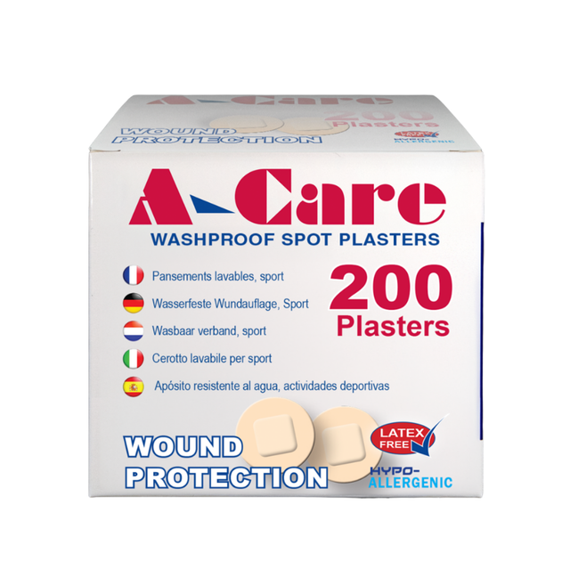 A-Care™ Washproof is recommended for all general applications, with latex free, hypo-allergenic adhesive and a soft cushioned non-adherent pad for comfort, cleanliness and ease of removal. 2.25cm - 100/Box