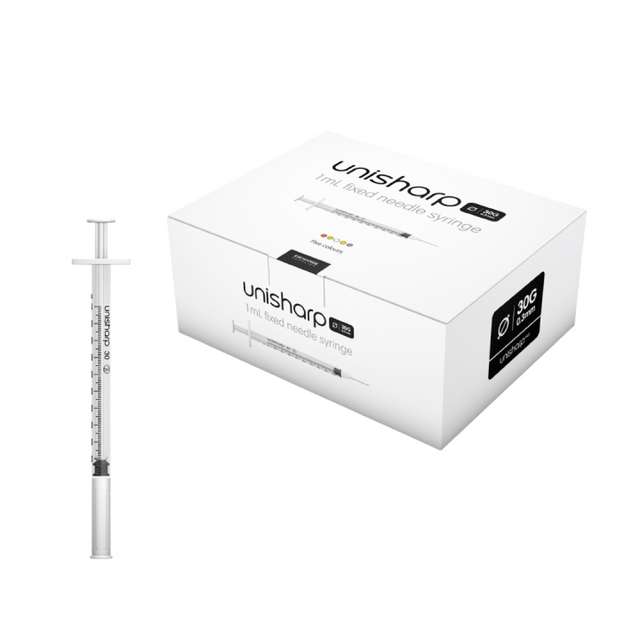 The Unisharp 1ml 30G fixed needle syringe is designed for injecting water-soluble drugs, making it ideal for intravenous use in small veins and subcutaneous hormone treatments, such as human growth hormone (HGH). It is also suitable for veterinary applications.