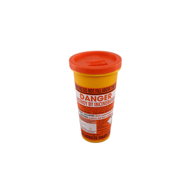 A general-purpose polypropylene sharps container providing maximum capacity in tight working spaces. A robust side handle prevents the container rolling and for safe transportation and ease of disposal. SHARPSGUARD® orange is a comprehensive range of containers for the disposal of sharps, excluding those contaminated with medicinal products and their residues. The container labels indicate that disposal should be by incineration or other authorised process.